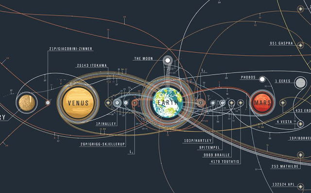 Impresionantul poster numit Chart of Cosmic Exploration documentează fiecare misiune spațială majoră începând de la Luna 2 în 1959 până la DSCOVR în 2015. Harta trasează traiectoriile fiecărui orbiter, lander, rover, flyby și impactor care au părăsit orbita Pământului și și-a îndeplinit cu succes misiunea. În plus, fiecare poster prezintă o serie de peste 100 de instrumente exploratorii cu redări ilustrate manual de fiecare navă spațială. Este minunat și frumos!